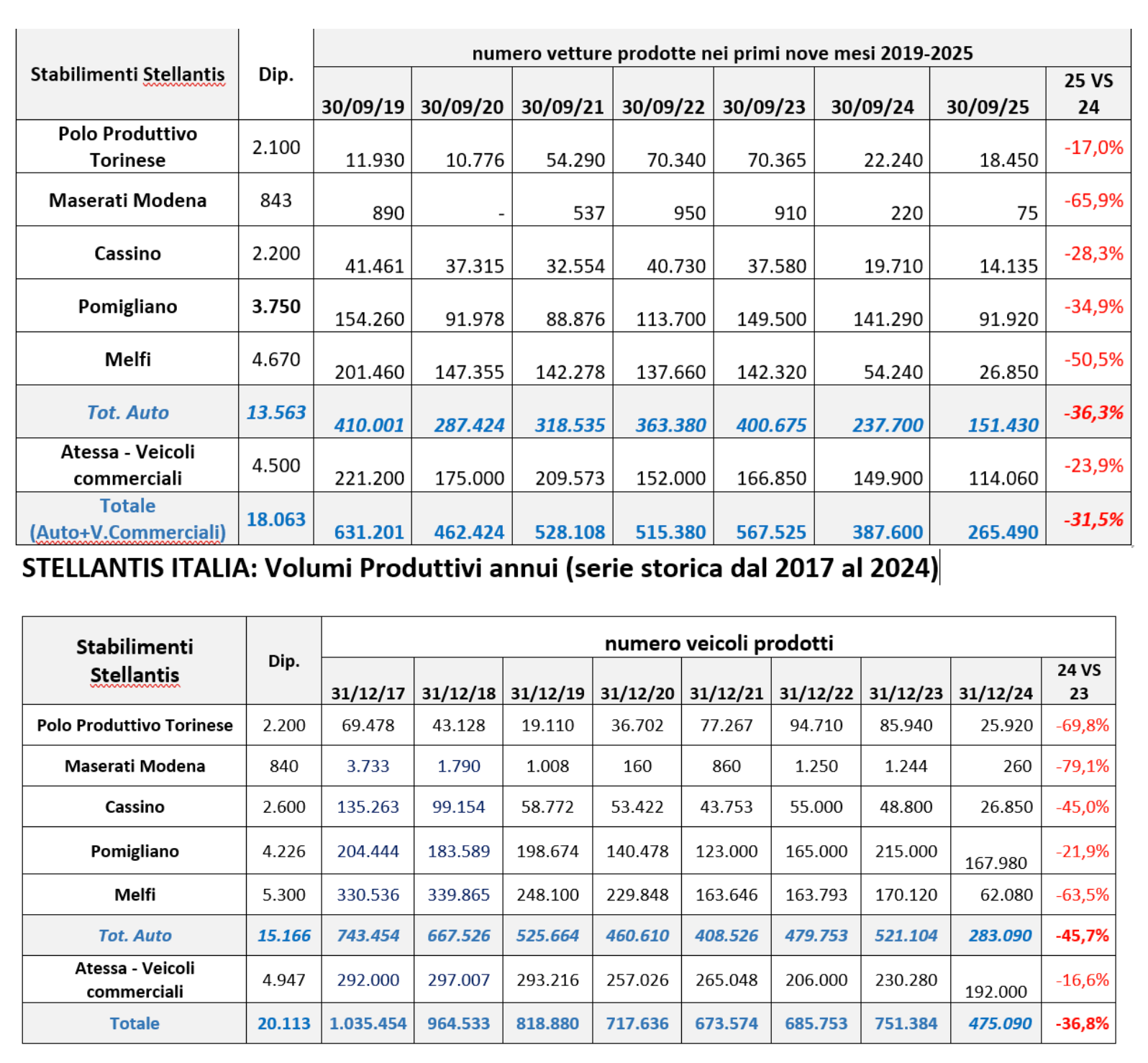 Stando ai dati diffusi dalla Fim – Cisl, prosegue il peggioramento dei dati produttivi rispetto al giร difficile 2024. Nei primi nove mesi del 2025 – si legge nella nota del sindacato – sono state realizzate complessivamente 265.490 unitร tra autovetture e veicoli commerciali, con un calo del -31,5% rispetto allo stesso periodo dellโanno precedente. Nel dettaglio: Autovettureย -36,3%ย (151.430 unitร ), Veicoli commercialiย -23,9%ย (114.060 unitร )