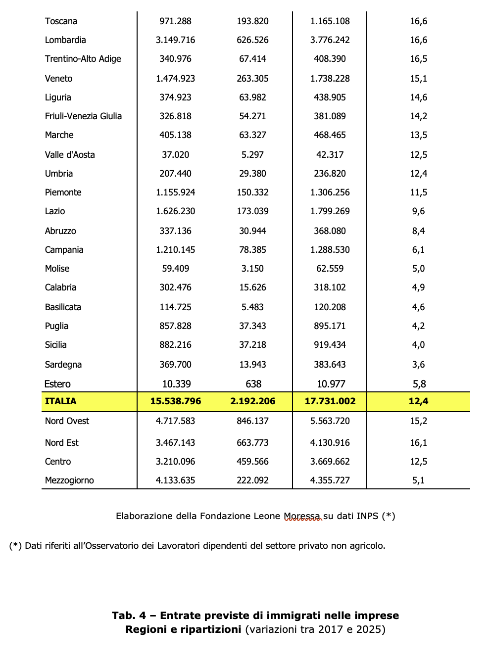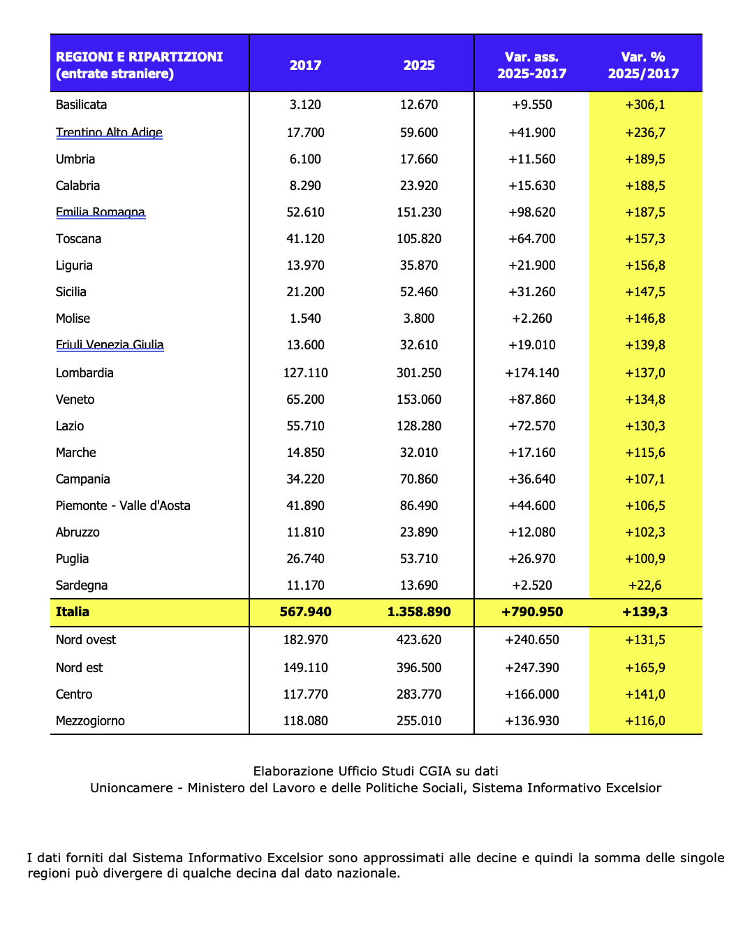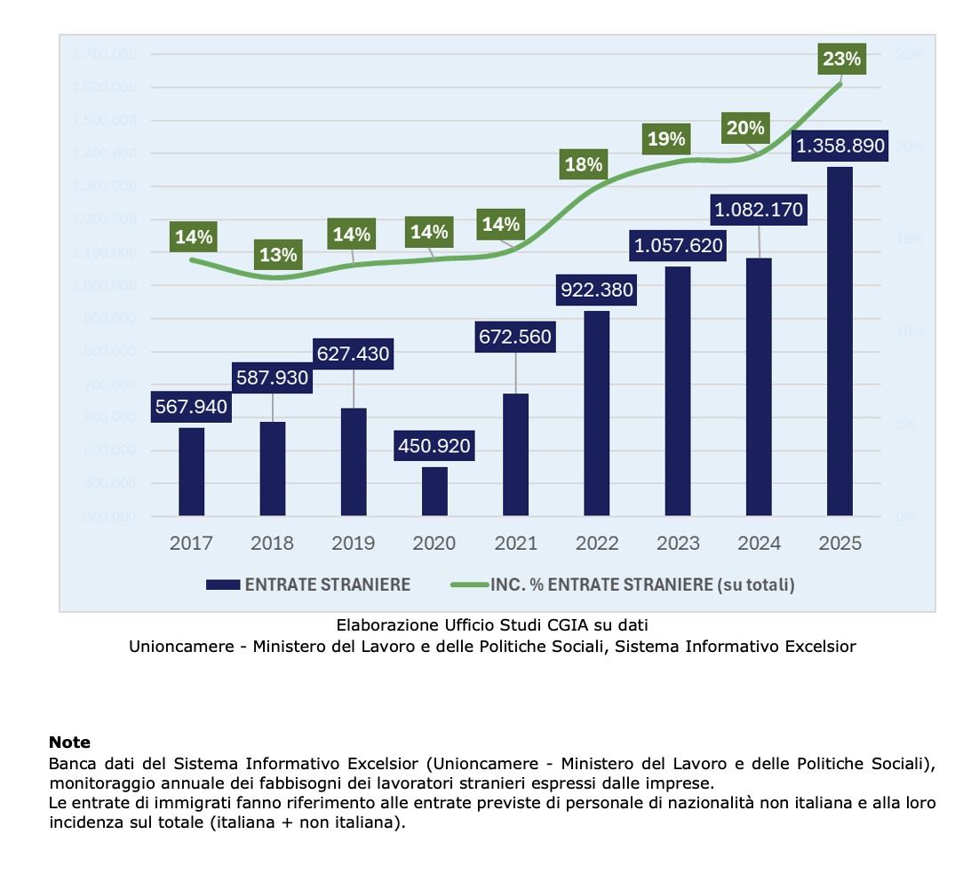 Se in Italia, negli ultimi otto anni (2017–2025), le entrate previste nel mercato del lavoro degli immigrati sono cresciute del 140 per cento, in