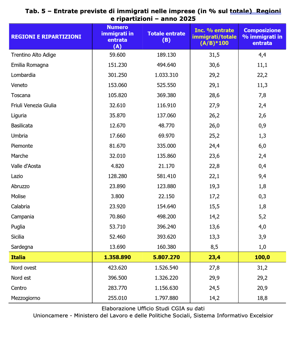 Se, invece, analizziamo solo il dato del 2025, l’incidenza percentuale delle entrate di lavoratori stranieri sul totale delle assunzioni più significativa si è registrata in Trentino-Alto Adige (31,5 per cento). Seguono l’Emilia-Romagna (30,6) e la Lombardia (29,2). La media italiana, come detto in precedenza, si è attestata al 23,4 per cento (vedi Tab. 5).