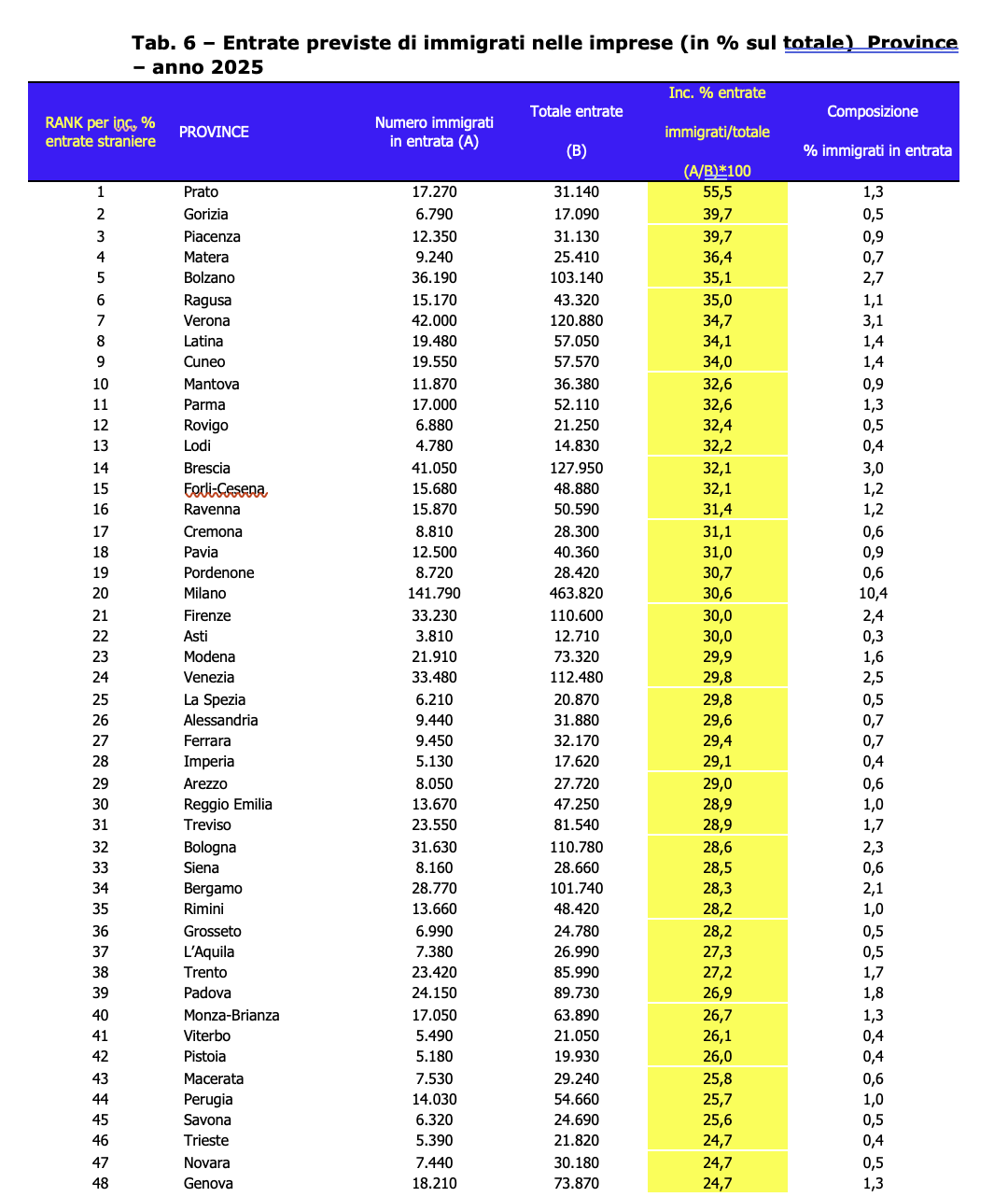 A livello provinciale, infine, gli ingressi previsti di immigrati nel mercato del lavoro nel 2025, rapportati al totale delle assunzioni, vedono prevalere la provincia di Prato, con un tasso del 55,5 per cento. Seguono Gorizia e Piacenza, entrambe con il 39,7 per cento, Matera con il 36,4 e Bolzano con il 35,1. In termini assoluti, l’area che ne prevedeva il maggior numero di assunzioni è Milano, con 141.790 persone. Seguono Roma con 96.660 e Verona con 42.000 (vedi Tab.6).