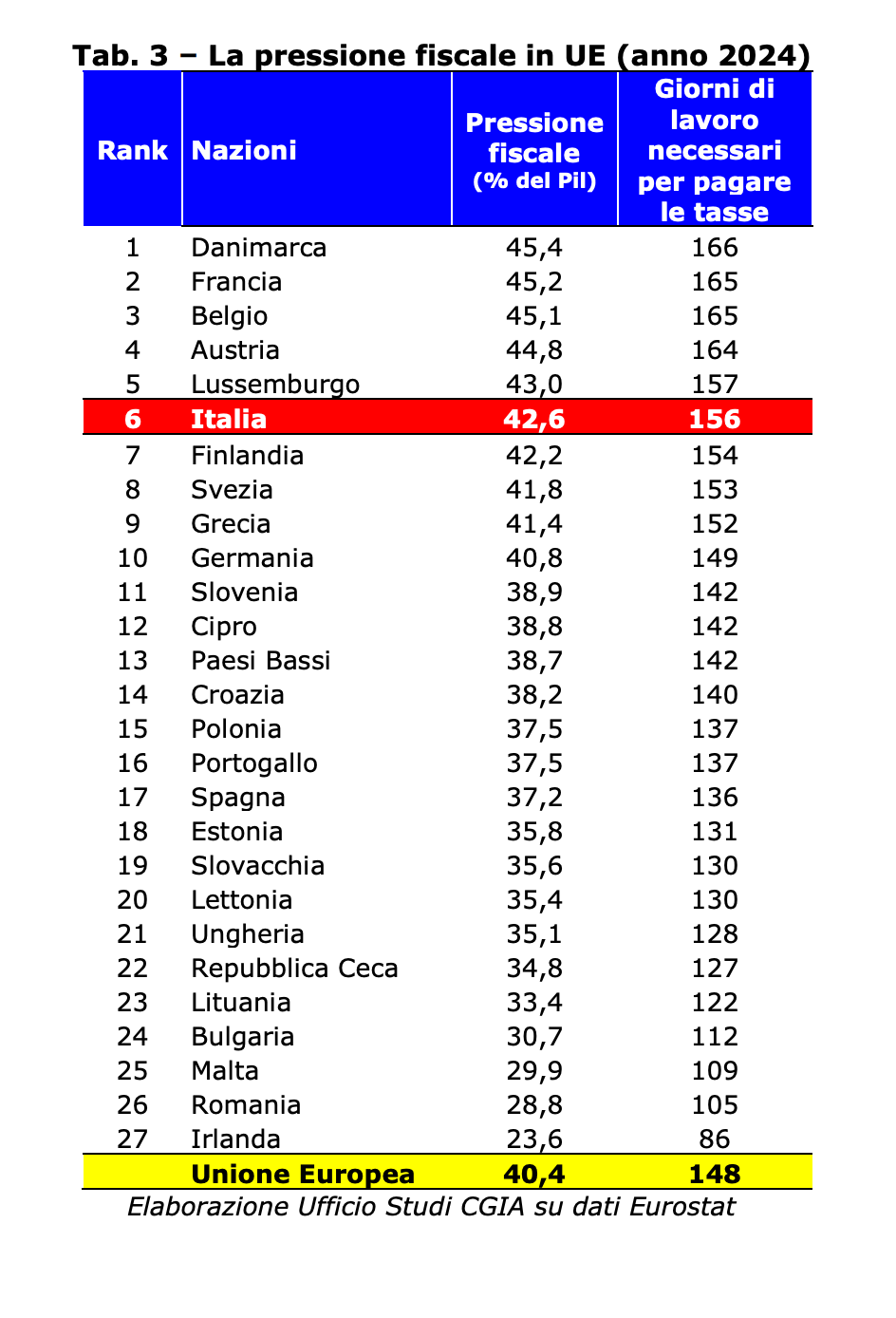 Nel 20241 la pressione fiscale in Danimarca era al 45,4 per cento del Pil, in Francia al 45,2, in Belgio al 45,1, in Austria al 44,8 e in Lussemburgo al 43. Tra tutti i Paesi dell’UE, l’Italia si posizionava al sesto posto con un tasso del 42,6 per cento del Pil. Se tra i nostri principali competitor commerciali solo la Francia presentava un carico fiscale superiore al nostro, gli altri, invece, registravano un livello nettamente inferiore. Se in Germania il peso fiscale sul Pil era al 40,8 per cento (1,8 punti in meno rispetto al dato Italia), in Spagna addirittura al 37,2 (5,4 punti in meno che da noi). Il tasso medio in UE, invece, era al 40,4, 2,2 punti in meno della nostra media nazionale (vedi Tab. 3).