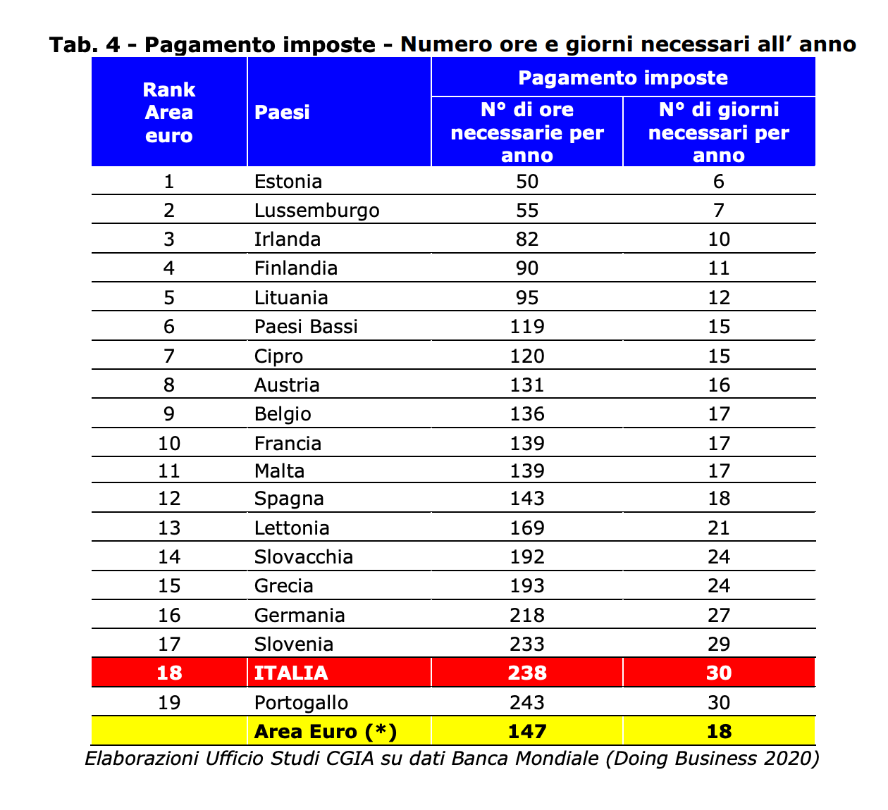 Oltre ad avere un carico fiscale tra i più elevati d’Europa, l’Italia è il Paese, assieme al Portogallo, dove pagare le tasse è più difficile, in particolar modo per le imprese. Secondo le ultime statistiche elaborate dalla Banca Mondiale2 , i nostri imprenditori “perdono” 30 giorni all’anno (pari a 238 ore) per raccogliere tutte le informazioni necessarie per calcolare le imposte dovute; per completare tutte le dichiarazioni dei redditi e per presentarle all’Amministrazione finanziaria; per effettuare il pagamento on line o presso le autorità preposte. In Francia per espletare le incombenze burocratiche derivanti dal pagamento delle tasse sono necessari solo 17 giorni (139 ore), in Spagna 18 (143 ore) e in Germania 27 (218 ore), mentre la media dell’Area dell’Euro è di 18 giorni (147 ore). I dati si riferiscono a una media impresa (società a responsabilità limitata), al secondo anno di vita e con circa 60 addetti (vedi Tab. 4).