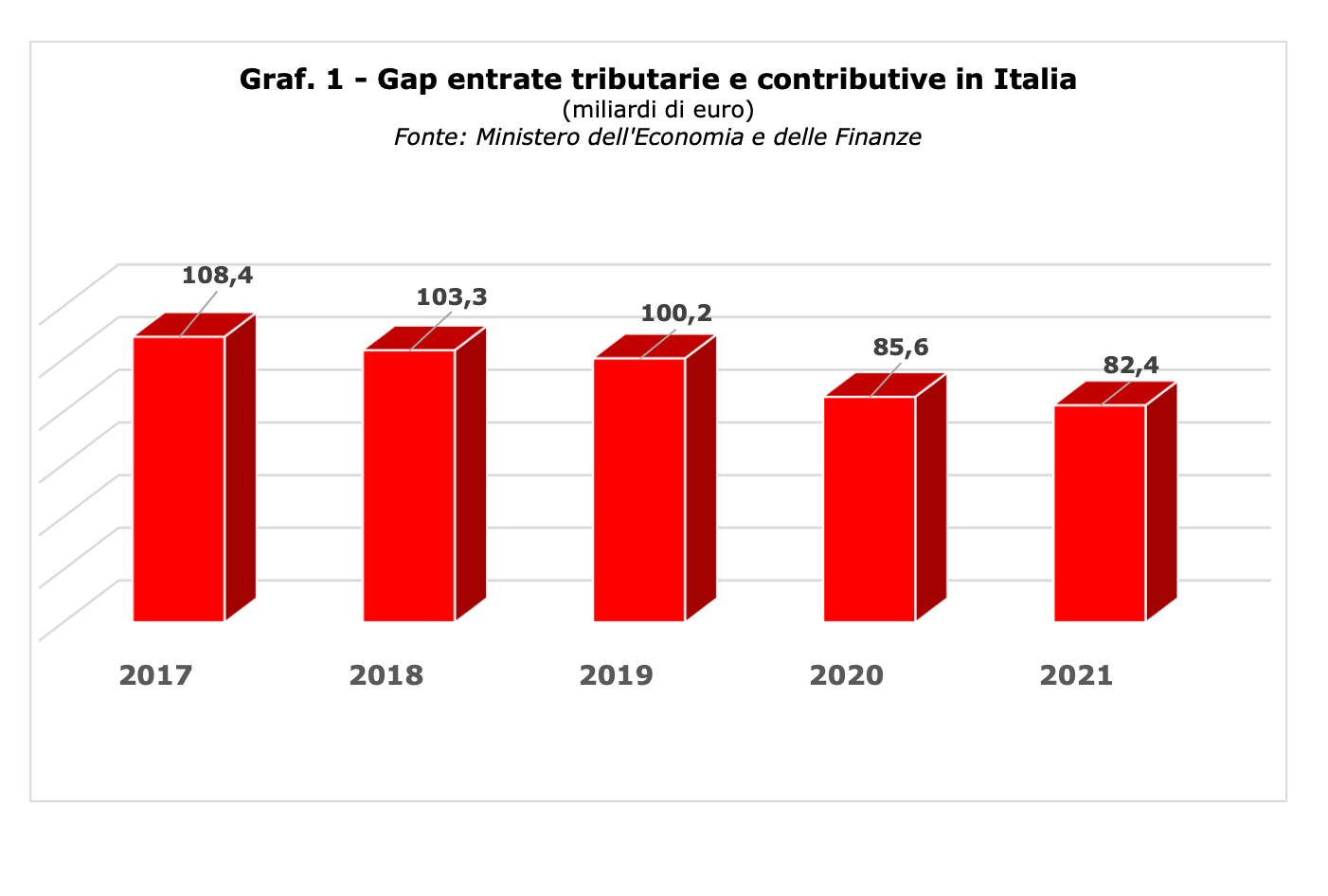 Nel 2024 l’Agenzia delle Entrate ha recuperato dalla lotta all’evasione fiscale 33,4 miliardi di euro; una cifra che costituisce un record assoluto. A questa buona notizia se ne affianca un’altra: secondo il Ministero dell’Economia e delle Finanze (MEF) l’evasione è in calo3 . Se nel 2017 toccava i 108,4 miliardi di euro, nel 2021, ultimo anno in cui il dato è disponibile, è scesa a 82,4 miliardi (vedi Graf. 1); di cui 72 sono ascrivibili al mancato gettito tributario e gli altri 10,4 sono il “frutto” dell’evasione contributiva. Sebbene non possiamo contare su oltre 82 miliardi di euro di entrate tributarie e contributive ogni anno, negli ultimi tempi l’Amministrazione finanziaria italiana ha imboccato la strada giusta e per gli evasori la vita è diventata molto più difficile.