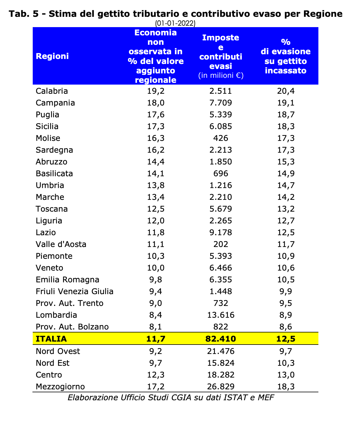 Se “regionalizziamo” gli 82,4 miliardi di euro7 di evasione fiscale stimati dal MEF (vedi Graf. 1), l’area geografica che in valore assoluto registra l’evasione più elevata d’Italia è la Lombardia con 13,6 miliardi. Seguono il Lazio con 9,2 e la Campania con 7,7. Rammentando che la Lombardia conta quasi 10 milioni di abitanti – mentre il Lazio e la Campania rispettivamente 5,7 e 5,6 – da un punto di vista comparativo è certamente più “corretto” misurare in mancato gettito imputabile agli evasori, calcolando l’incidenza percentuale dell’evasione sul gettito tributario e contributivo incassato in ciascuna regione. Ebbene, se decidiamo di utilizzare questa modalità, il tasso di evasione più elevato si attesta al 20,4 per cento e riguarda la Calabria. Al 19,1 scorgiamo la Campania, al 18,7 la Puglia e al 18,3 la Sicilia. L’area più “fedele” al fisco d’Italia, invece, risulta essere la Provincia Autonoma di Bolzano con un tasso dell’8,6 per cento. La media Italia è al 12,5 per cento (vedi Tab. 5).