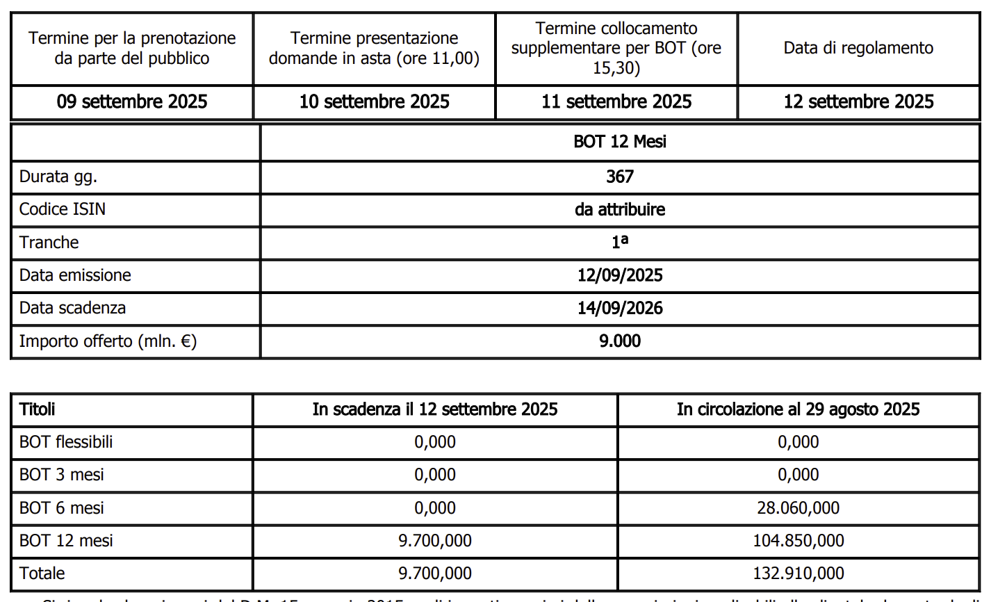 Si comunica che, in seguito all’assenza di specifiche esigenze di cassa, il giorno 10 settembre 2025 non verrà offerto il BOT trimestrale.