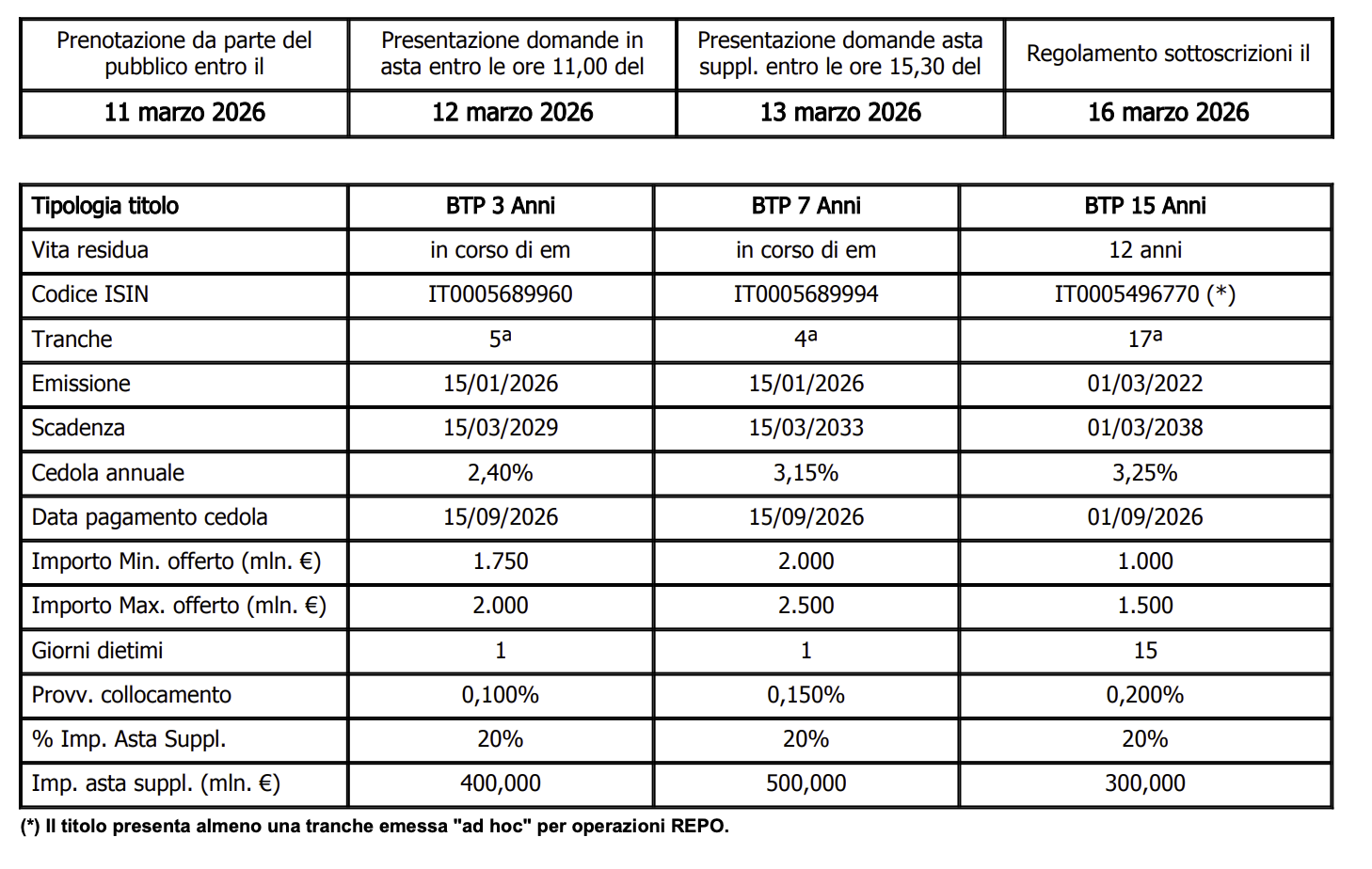 Il collocamento è previsto per giovedì 12 marzo 2026, mentre il regolamento delle operazioni è fissato per lunedì 16 marzo 2026.