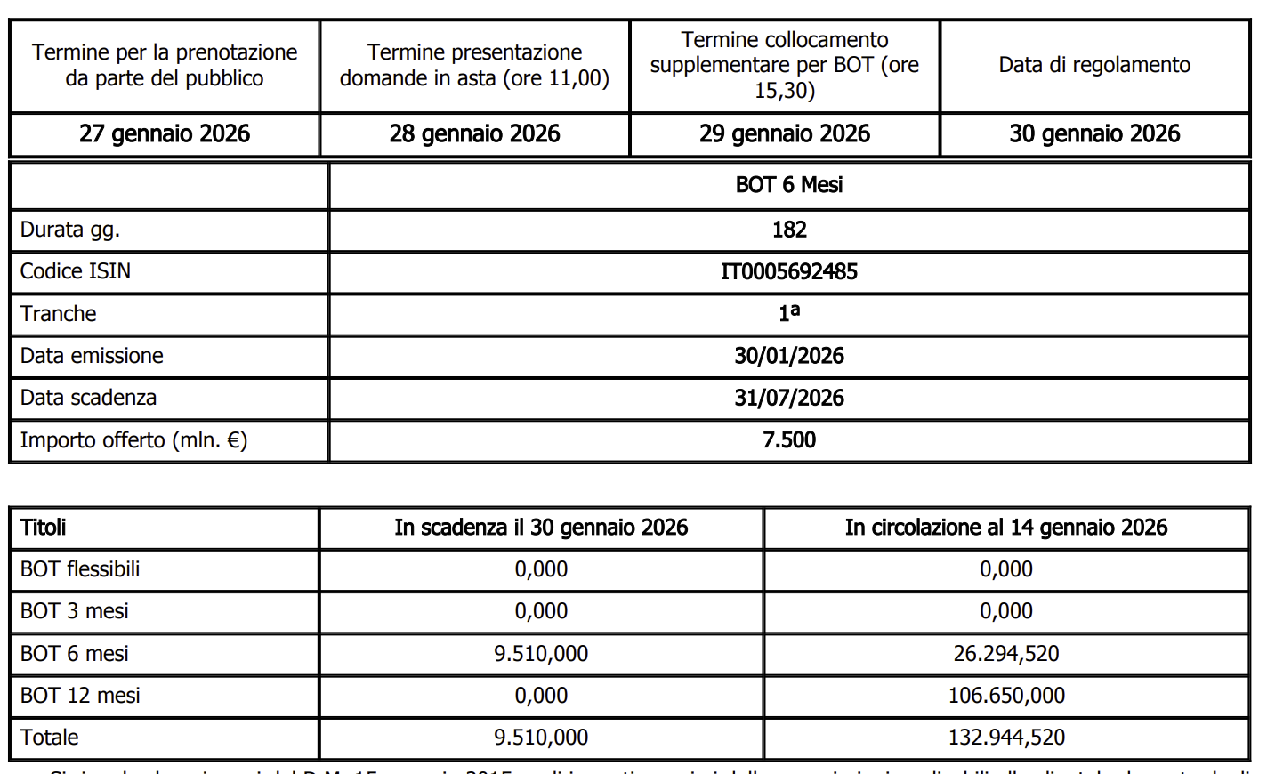 L’asta è in programma per mercoledì 28 gennaio 2026, mentre il regolamento dei titoli sottoscritti avverrà venerdì 30 gennaio 2026. L’operazione si inserisce nel consueto calendario di gestione del debito pubblico.