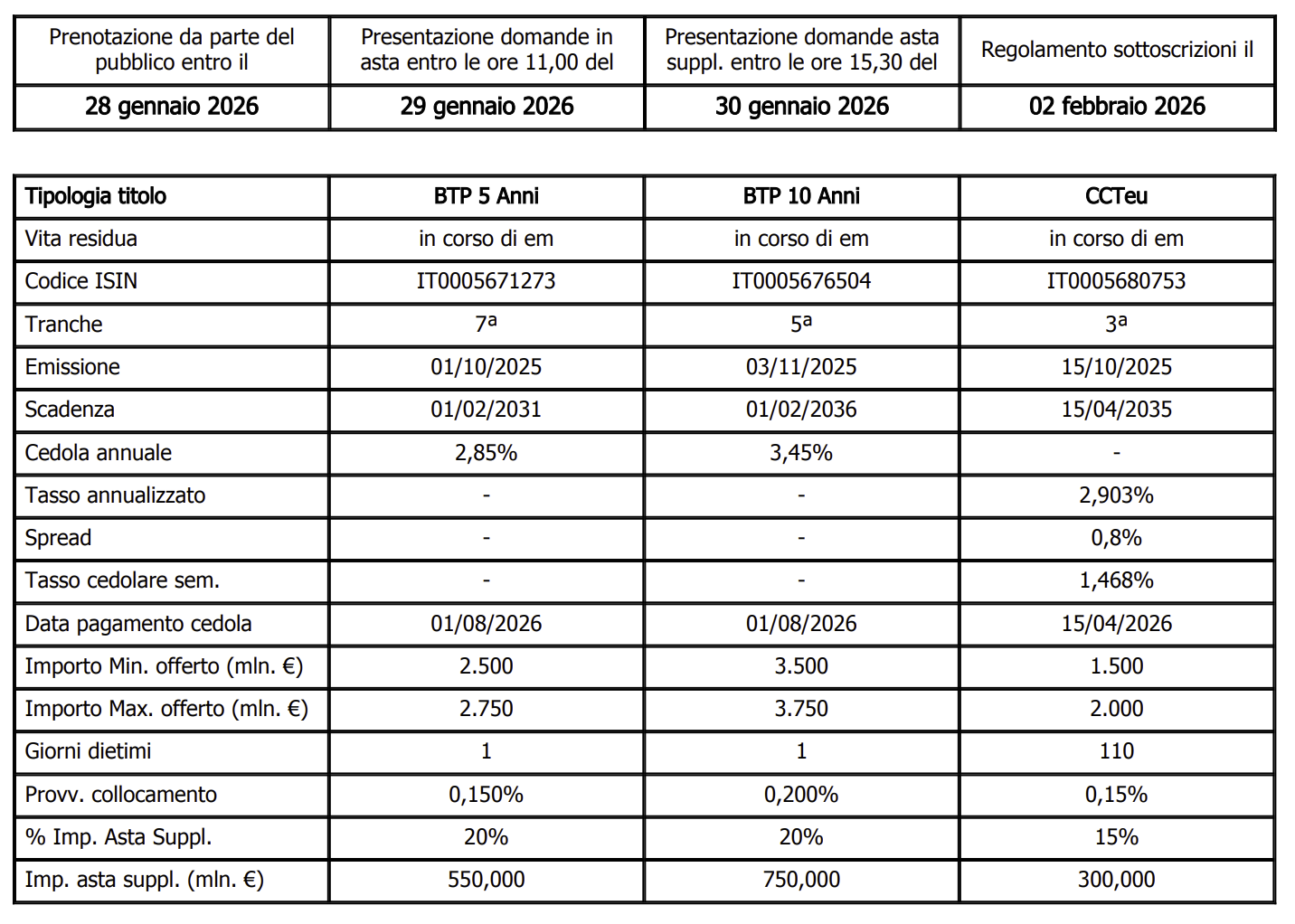 Secondo quanto comunicato dal Ministero dell’Economia e delle Finanze, l’operazione prevede l’offerta della settima tranche del Btp quinquennale con scadenza 1° febbraio 2031, per un importo compreso tra 2,5 e 2,75 miliardi di euro. In asta anche la quinta tranche del Btp decennale con scadenza 1° febbraio 2036, per una forchetta di 3,5-3,75 miliardi di euro.