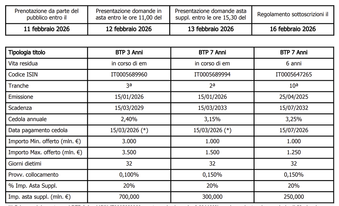 Il Ministero dell’Economia e delle Finanze ha comunicato una nuova operazione di collocamento sul mercato dei titoli di Stato, con un’emissione complessiva che potrà arrivare fino a 6,25 miliardi di euro in BTP con durate a tre e sette anni. L’asta è fissata per giovedì 12 febbraio 2026, mentre il regolamento delle sottoscrizioni è previsto per lunedì 16 febbraio 2026.