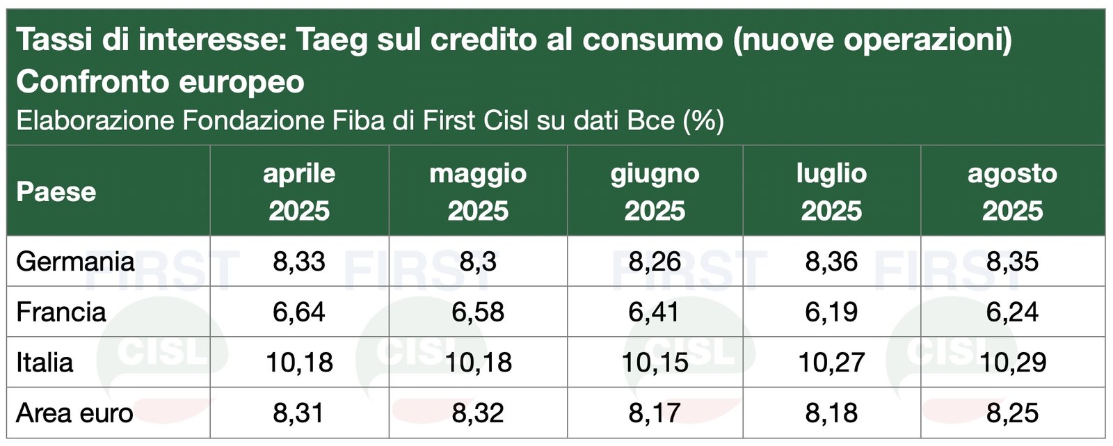 L’Italia si conferma ai primi posti in Europa per i costi che i consumatori sono chiamati a sopportare sui finanziamenti personali: una tendenza, questa, che trova conferma anche nel secondo trimestre del 2025. A rilevarlo è la Fondazione Fiba di First Cisl nella sua analisi periodica condotta su dati Bankitalia e Bce. Ad agosto il Taeg sulle nuove operazioni ha ripreso a correre e si è attestato al 10,29%, dato che resta significativamente più elevato sia rispetto alla media dell’area euro (8,25%) che a quello di Francia (6,24%) e Germania (8,35%).