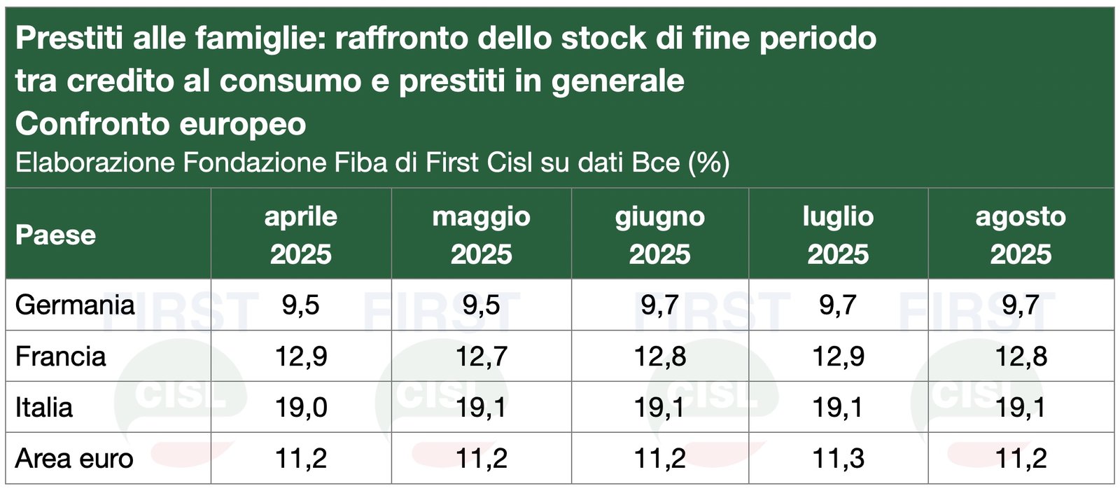 Proseguendo nel confronto europeo, il nostro Paese svetta anche per quanto riguarda la quota destinata al credito al consumo sul totale dei prestiti richiesti, ferma ad agosto al 19,1%. Marcato il divario rispetto all’11,2% della media dell’area euro. Ancor più lontane, in questa classifica, restano Germania e Francia, che si fermano rispettivamente al 9,7% e al 12,8%.