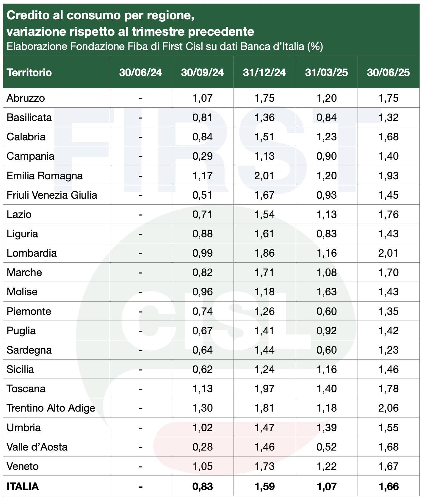 Tra le regioni, il secondo trimestre del 2025 fa segnare gli aumenti più significativi dell’ammontare dei finanziamenti in Trentino Alto Adige (+ 2,06%), Lombardia (+ 2,01%) ed Emilia Romagna (+ 1,93%), quello minore in Sardegna (+ 1,23%).