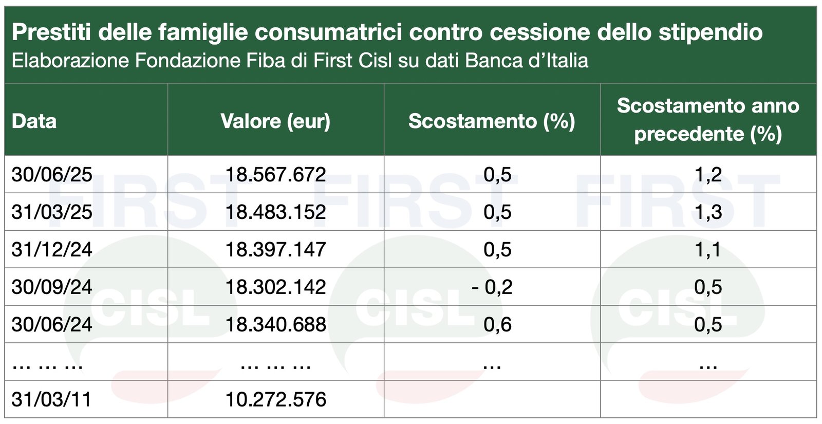 Va segnalata inoltre la crescita continua del fenomeno della cessione del quinto dello stipendio, una forma di prestito che, quando correlato ai consumi, denota implicazioni sul terreno sociale che non possono non destare preoccupazione. Dal 2011 al giugno 2025 l’ammontare di questi prestiti è pressoché raddoppiato, passando da poco più di 10 a circa 18,5 miliardi. Su base annua, rispetto al giugno 2024, la crescita è stata dell’1,2%.