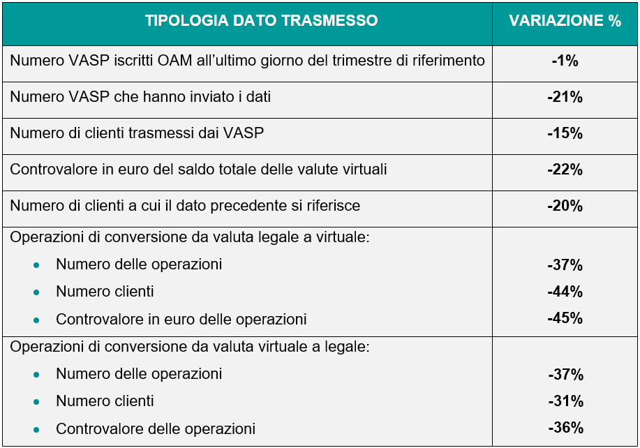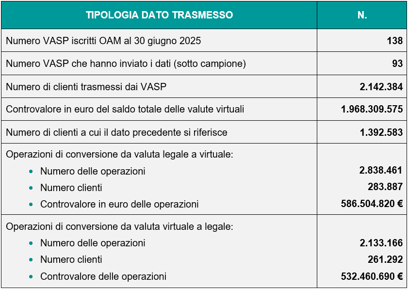 È quanto emerge dall’analisi dei flussi trimestrali inviati all’Organismo Agenti e Mediatori dai VASP (Virtual Asset Service Provider) relativi al secondo trimestre di quest’anno. Il numero dei VASP iscritti allo speciale Registro tenuto dall’OAM è diminuito, al 30 giugno 2025, dell’1%, passando da 140 a 138 operatori. Inoltre, si registrano variazioni percentuali negative sul numero dei clienti trasmessi (-15%).