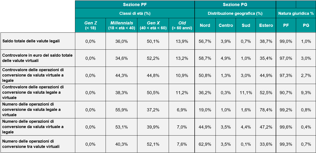 Dal lato della domanda, rappresentata dalla clientela che richiede i servizi dei VASP, sia i saldi totali delle valute legali e virtuali che il controvalore delle operazioni di conversione delle valute virtuali in valute legali e viceversa, assumono percentuali rilevanti soprattutto per i clienti con età compresa tra 40 e 60 anni, seguiti dai millennials.