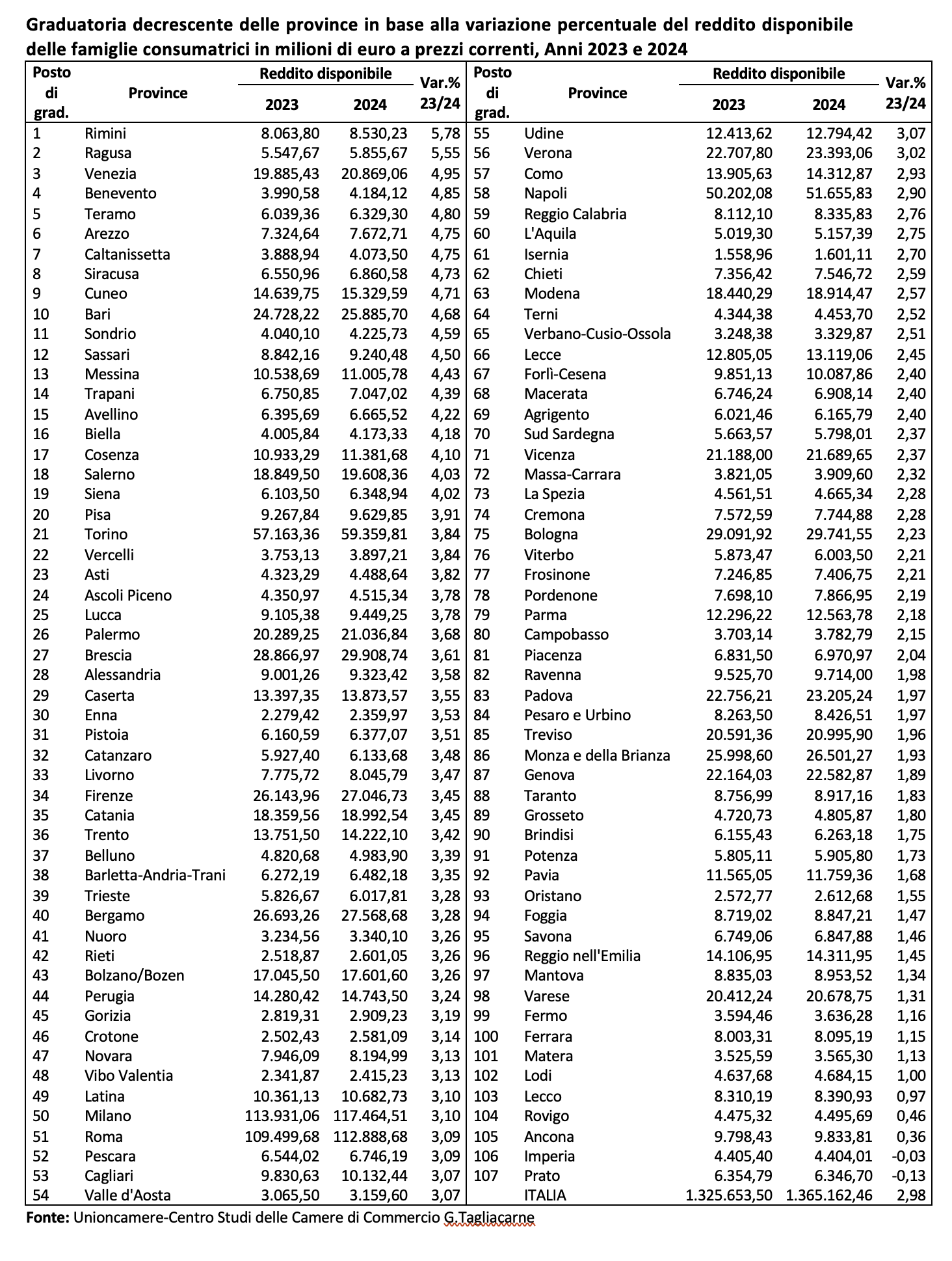 Il reddito disponibile delle famiglie cresce di più al Mezzogiorno rispetto al resto del Paese: 3,38% contro 2,84% nel 2024 rispetto al 2023. A conferma del migliore andamento del Sud, ben sei province meridionali conquistano le prime dieci posizioni della classifica nazionale guidata da Rimini (+5,78%), Ragusa (+5,55%) e Venezia (+4,95%). Mentre Prato -0,13%, Imperia -0,03% e Ancona +0,36% mostrano più difficoltà.